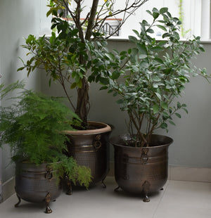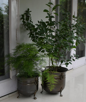 Imagine that you’ve got a lovely courtyard or patio and you the perfect plant for the space and it comes in a very disappointing pot. Or you have a lovely wooden floor and you’ve got this sunlit greenery-filled room in mind, but you know the water from the pots is going to ruin your floor. What do you do? Its very simple really, you put the plant with its pot in a cachepot. Our gorgeous cachepots are elegant and understated. Always complementing the decor of any space and letting the plant shine through. Whether you choose the soft curve of the Lion design or the classic lines of the Copper Finial design, you are going to love how it makes your space and your plants look.