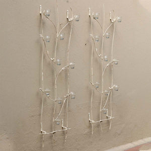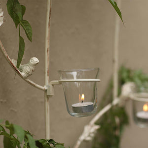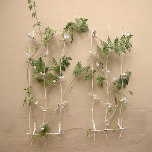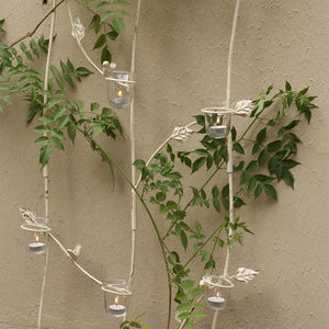Add charm to your outdoor space with our Twining Leaf Bird Trellis with Wall Hooks and 10 Votives. The whimsical design of twining leaves and chirpy birds, finished with an elegant hand antiqued ivory powder coating, creates a cozy ambiance with flickering candlelight. It's a functional and decorative support for climbing plants or a statement piece for enhancing your garden. Its durable construction and high-quality finish withstand harsh weather and provide years of enjoyment. Get this must-have item for garden lovers and decor enthusiasts to create a warm and inviting atmosphere in your outdoor area.