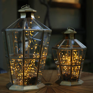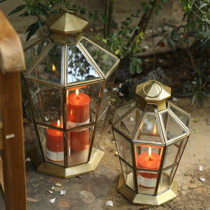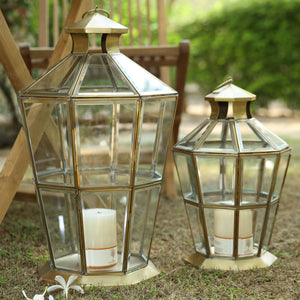 The bevelled glass lantern is a work of art! It's made of brass with a matte brass finish, and the octagonal shape makes it stand out. The bevelled glass gives off a soft light, making it perfect for using as a table lamp or an accent lamp.