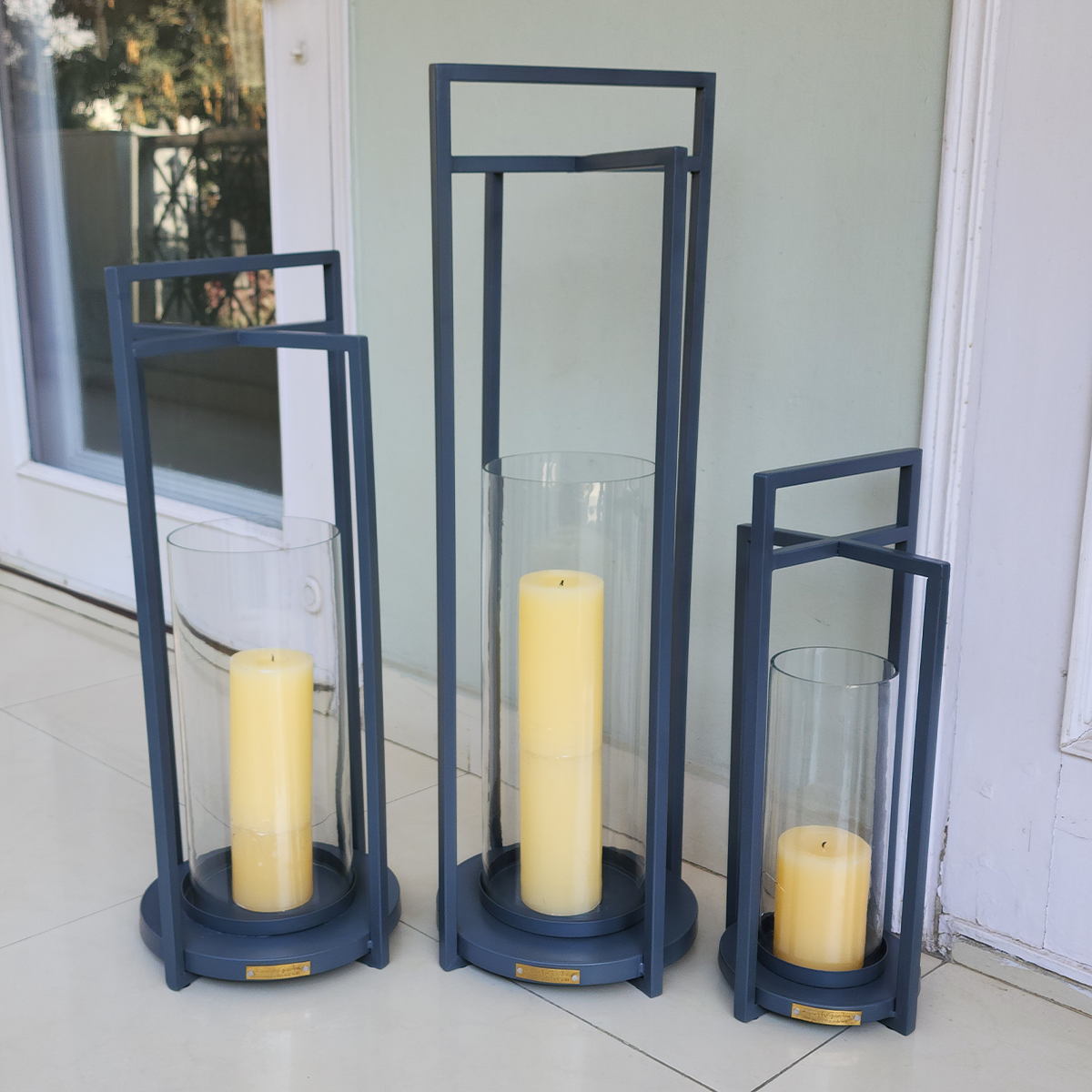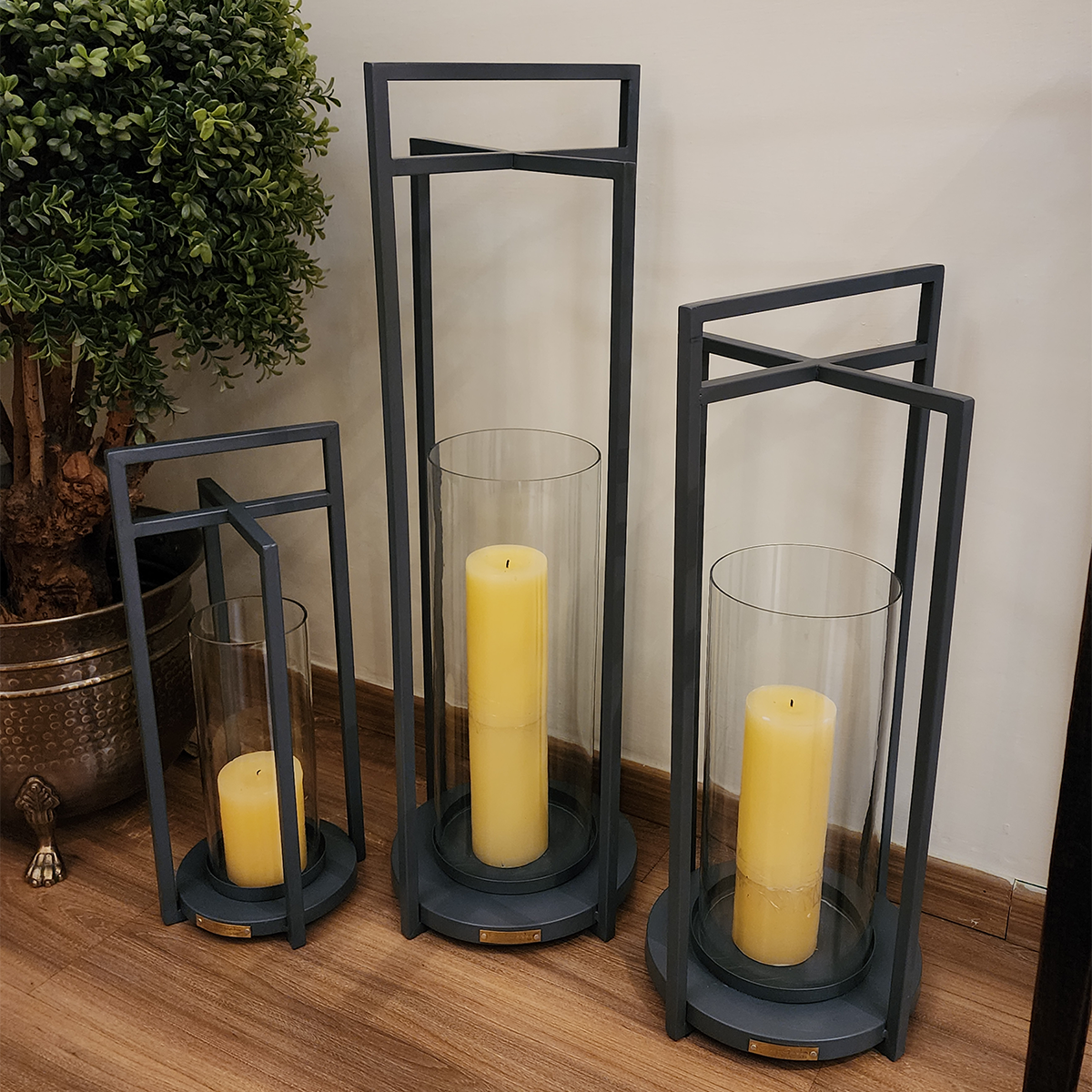 18" NET Height x 7.5" SQUARE. Glass : 4" Dia. x 10" Ht. ( for 3" Pillar Candle), 24" NET Height x 10.5" SQUARE. Glass : 6"Dia. x 13.5" Ht. (for 5" pillar Candle), 30" NET Height x 10.5" SQUARE. Glass: 6" Dia. x 16" Ht. ( for 5" Pillar Candle) |