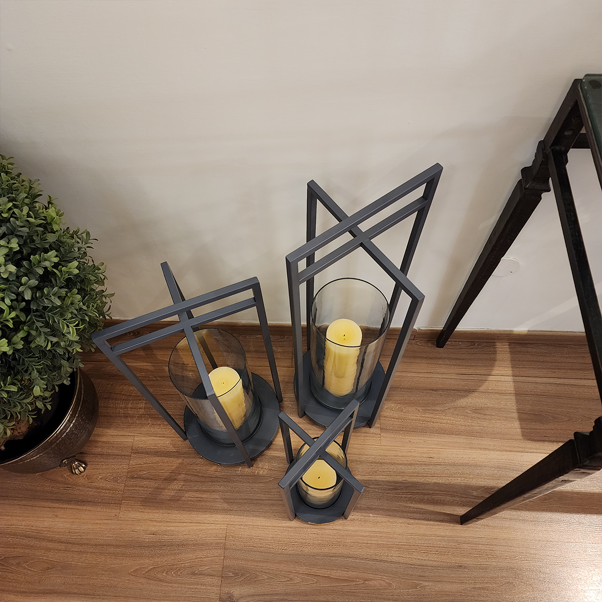 Crafted from durable mild steel and finished in a protective grey powder coat, this piece adds a warm and inviting glow to any space. The sleek, minimal design with a clear glass holder seamlessly fits both indoor nooks and outdoor gatherings.