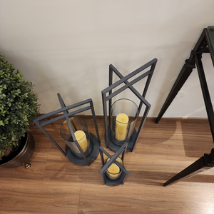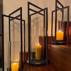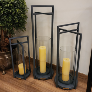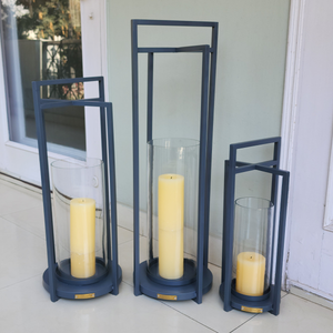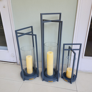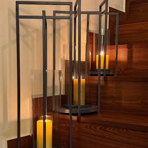 18" NET Height x 7.5" SQUARE. Glass : 4" Dia. x 10" Ht. ( for 3" Pillar Candle), 24" NET Height x 10.5" SQUARE. Glass : 6"Dia. x 13.5" Ht. (for 5" pillar Candle), 30" NET Height x 10.5" SQUARE. Glass: 6" Dia. x 16" Ht. ( for 5" Pillar Candle), Set of 3 + 3 LED Lights |