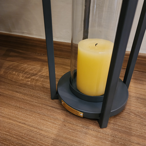 Crafted from durable mild steel and finished in a protective grey powder coat, this piece adds a warm and inviting glow to any space. The sleek, minimal design with a clear glass holder seamlessly fits both indoor nooks and outdoor gatherings.